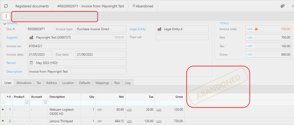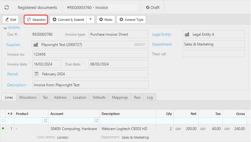 If the Registered Document is not a purchasing document, for example a statement, then it can be Abandoned.