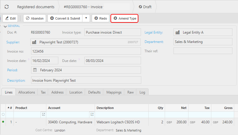 If the Registered Document has been incorrectly matched to a Cash Purchase instead of a Purchase Invoice, or vice versa, then use the Amend Type option to change to the correct document.