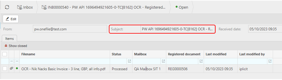 Inbox item - the original scanned email ID that had the document attached. Selecting Ctrl, underscores the Inbox items and selecting one takes you to the Inbox message view showing further details.