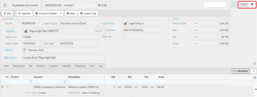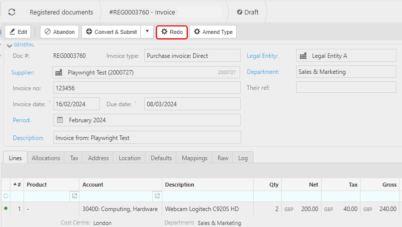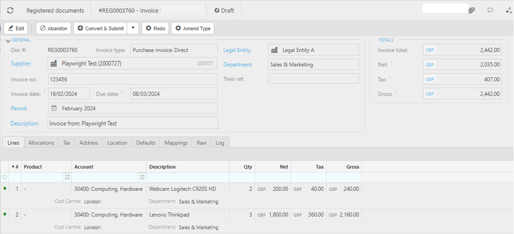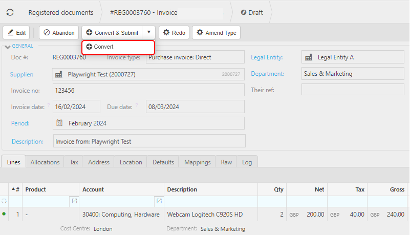 Once all amendments have been checked in the section above, the Registered document can then be converted to the appropriate iplicit document - Purchase Invoice, Purchase Order, Cash Purchase or Credit Note.