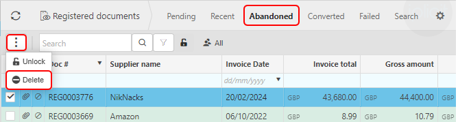 After emails have been scanned via the AP automation process, any attached documents will then be stored as draft Documents in the Registered Documents. These documents will now show by selecting the Pending set.