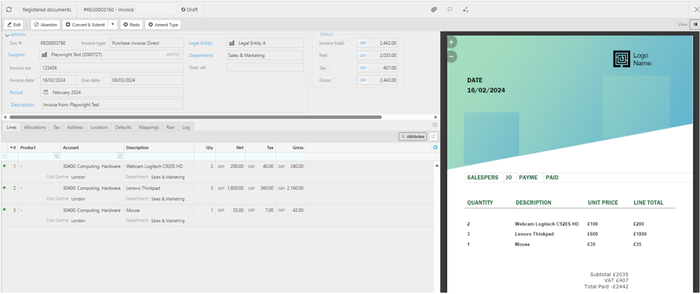 Your Registered Document will now be correctly matched to either a Cash Purchase or a Purchase Invoice.