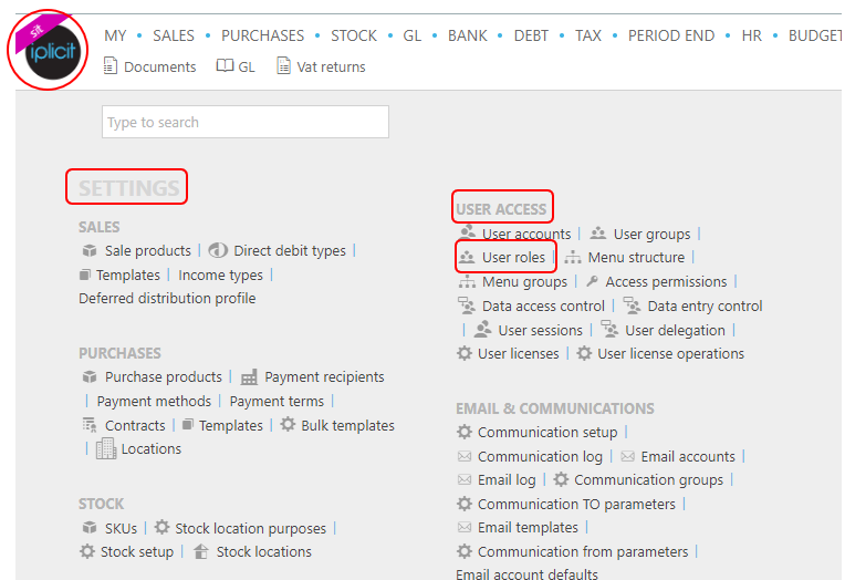 Either select User roles from User access in the Settings section of the pulse menu -