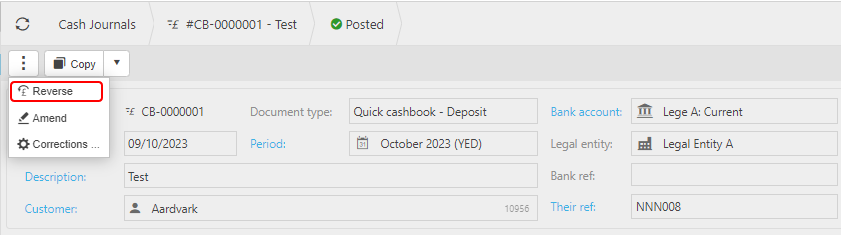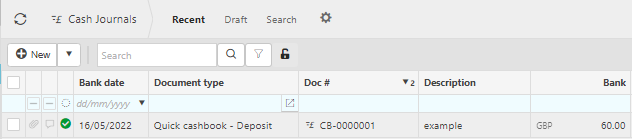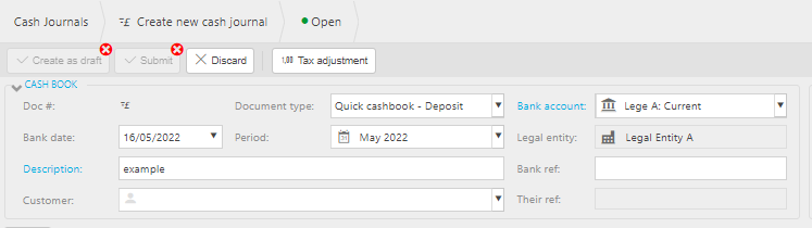 - Document type: This is the cash journal type e.g. deposit or withdrawal.