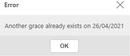 As part of the Credit control operations if it has been agreed to allow additional time a Grace period can be applied to avoid un-necessary debt chasing. An error will display if there is any attempt to apply an update to an account with a Grace period.