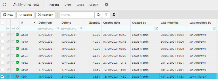 - Once you have entered the appropriate menu for My timesheets, the screenshot below shows a sample grid of timesheets, which includes some key information.