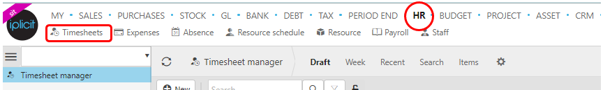 To enter a Timesheet for another user, as long as you have been delegated access to do so, either select Timesheets in HR menu from the pulse menu -