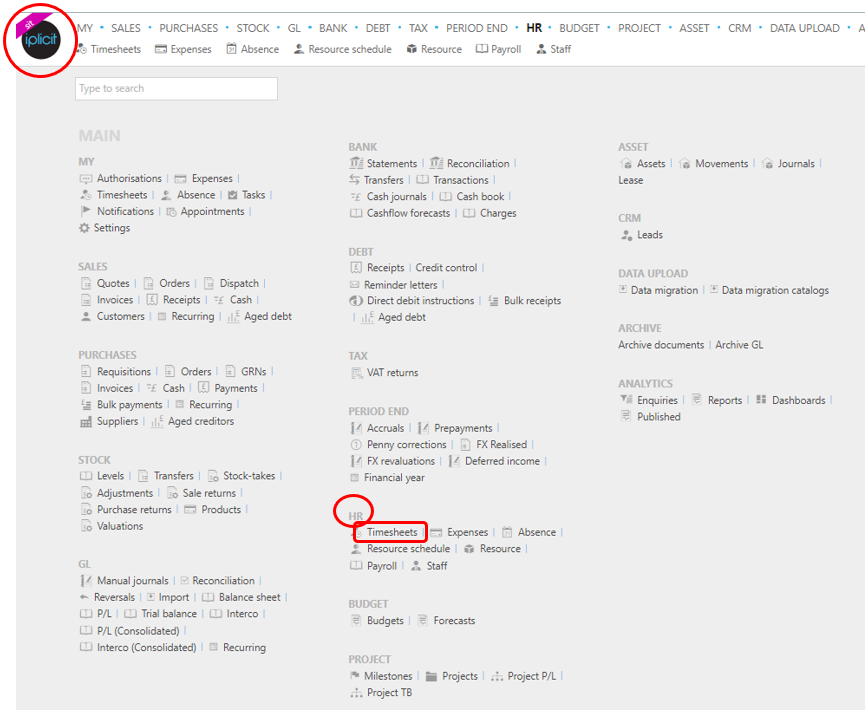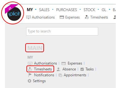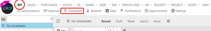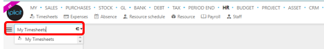 To enter your own Timesheet, either select Timesheets in My menu from the pulse menu -