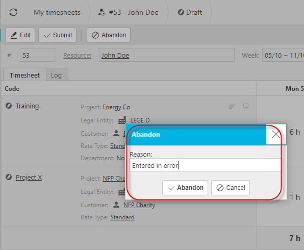 You must enter a reason to explain why you wish to abandon a timesheet.