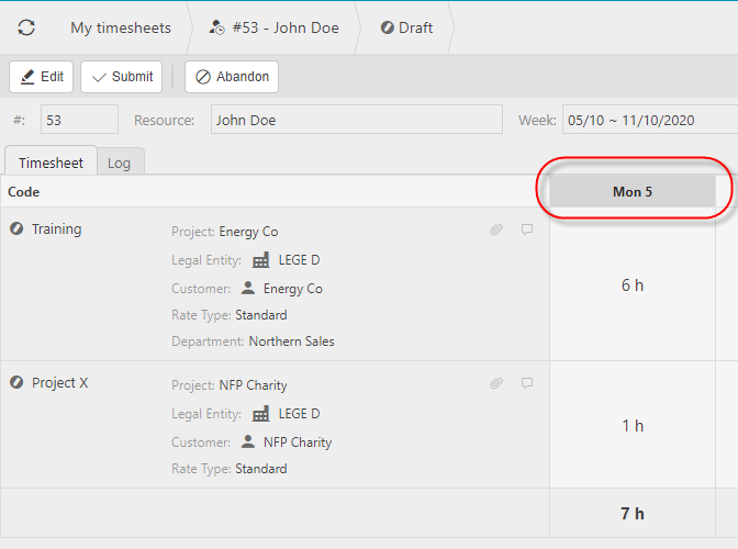 - If a timesheet is sent for approval, it will be assigned a Pending status and icon.
