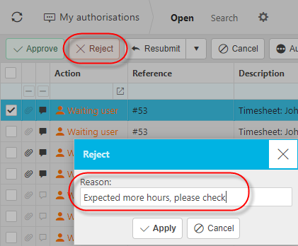Rejection requires an explanation of why the timesheet was rejected. This is used to advise the person receiving the rejection, how to progress it.