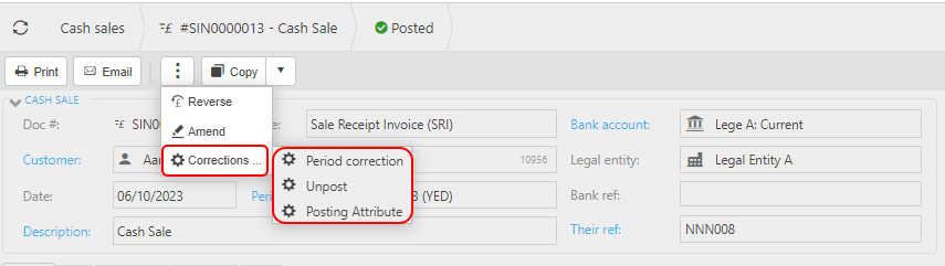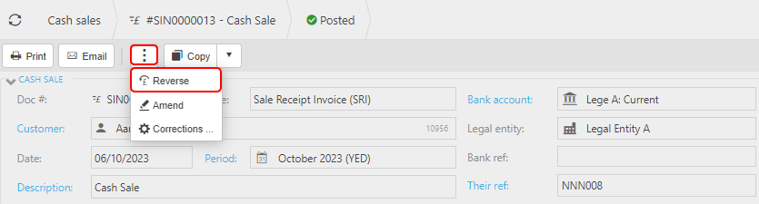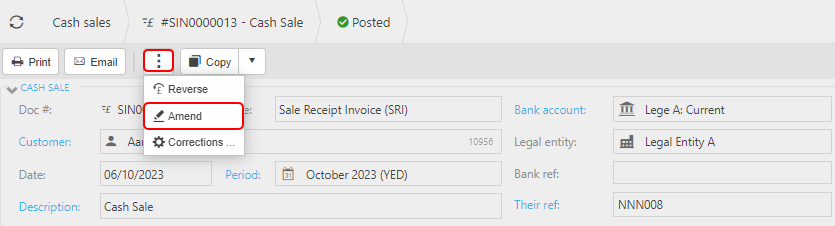 Select and open the posted Cash sale (either highlighted on the list or open the Payment), then press Amend option from the