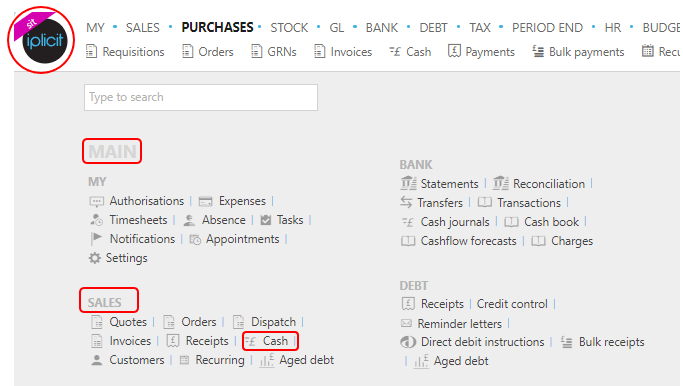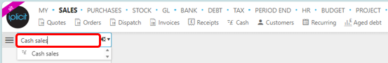 or enter Cash sales in the Quick Launch Side Menu.