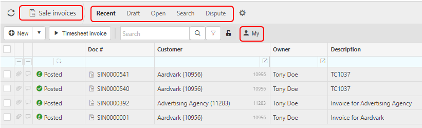 This will then show the Sales Invoices on the system where normal customisation of Sets can be used. Also, depending on User roles, the My/All option will be showing.