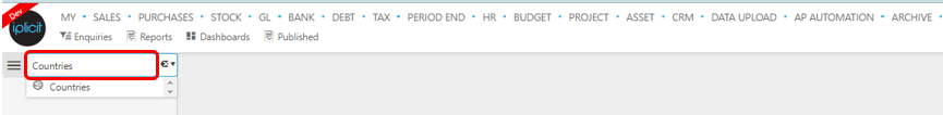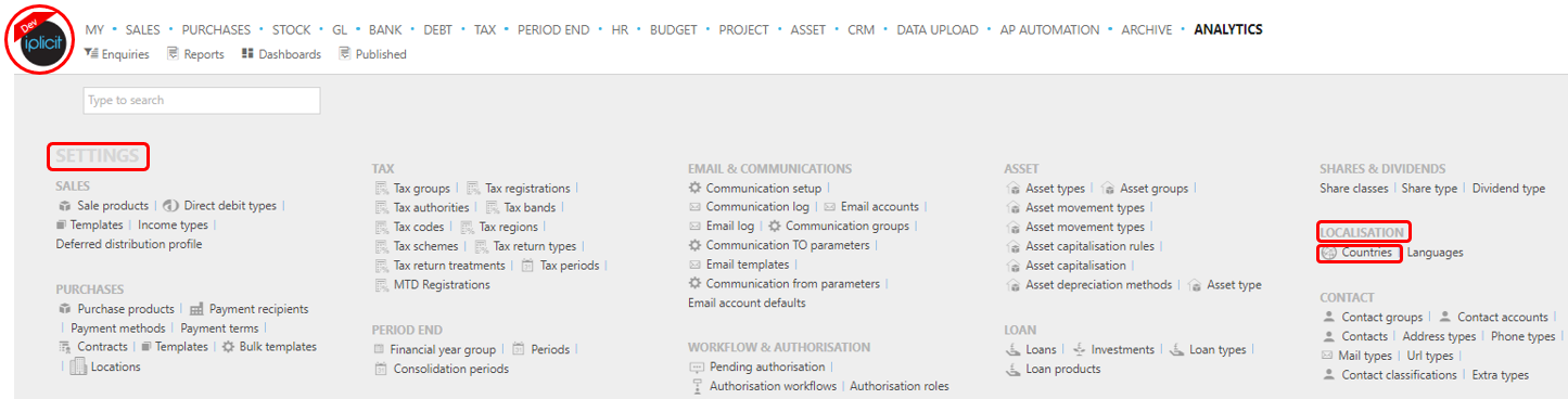 In iplicit, go to the Countries menu by either selecting Countries from Localisation in the Settings section from the pulse menu -