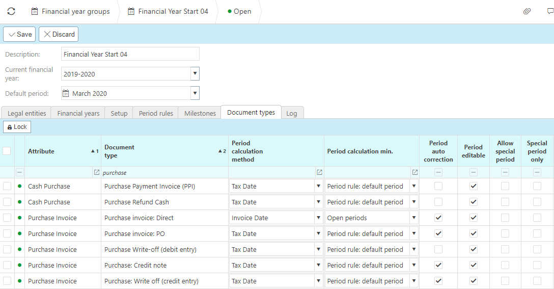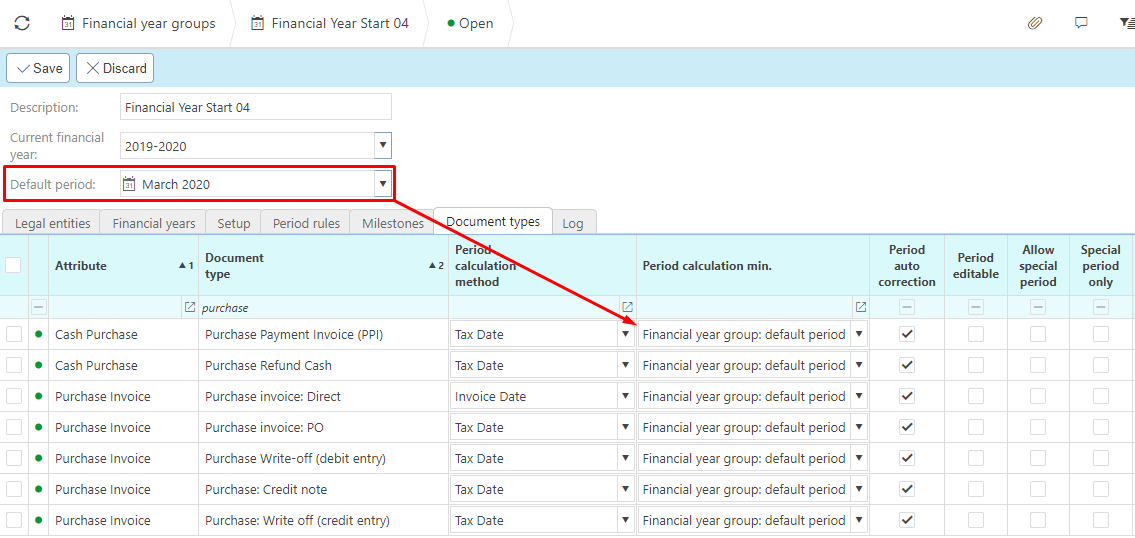 - Default period: this is the Period that will be used as default on the creation of a Document type (document type setup dependent).