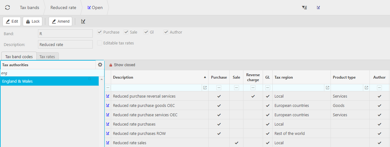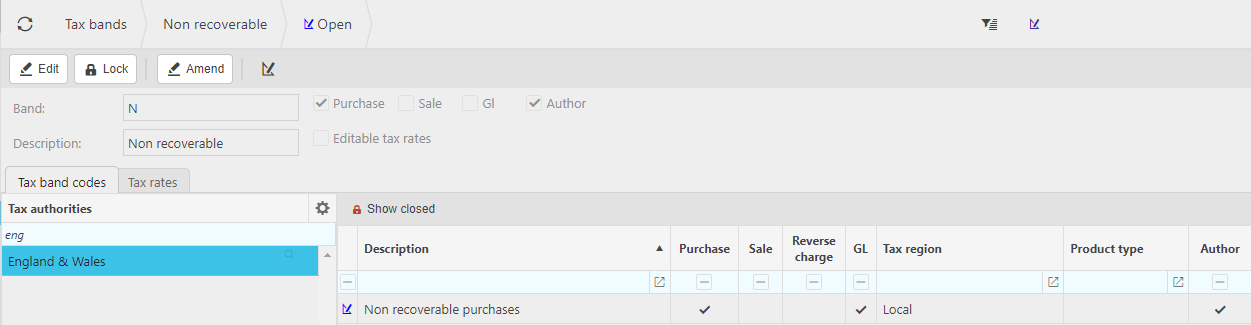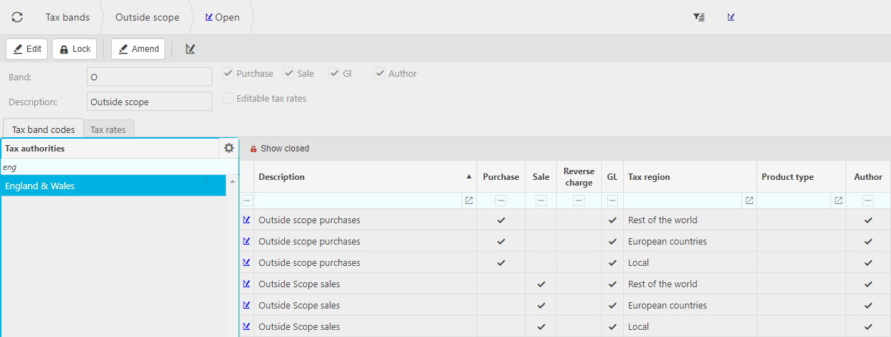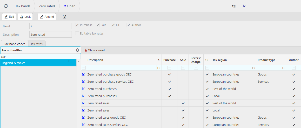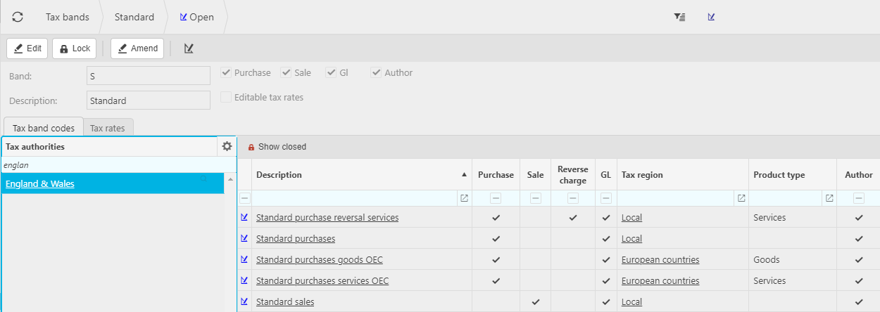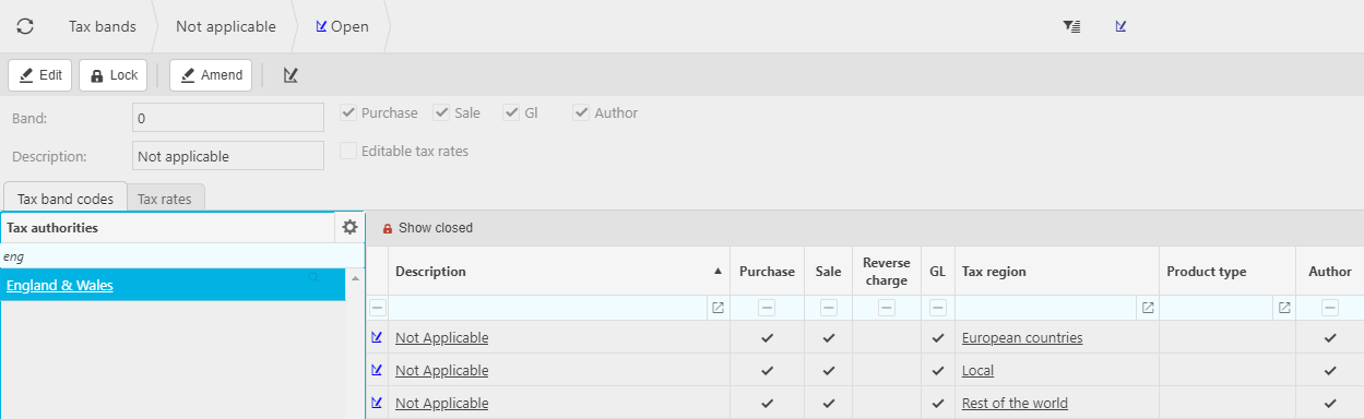 The following example is the "standard" tax band which is available in EW and shows the related Tax Codes and Tax Regions.