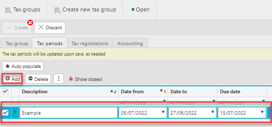 You can auto populate the tax periods or enter manually using the Add button then entering the tax period fields.