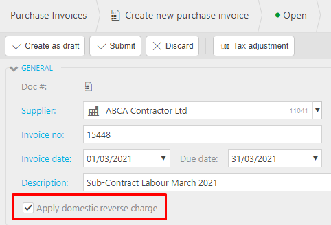 To override the default setting on the supplier record (for example a materials only invoice), untick "Apply domestic reverse charge". Standard VAT will be applied to the invoice.