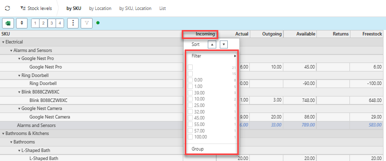 - Incoming: The amount of stock coming in e.g. stock that has been purchased but not yet received.